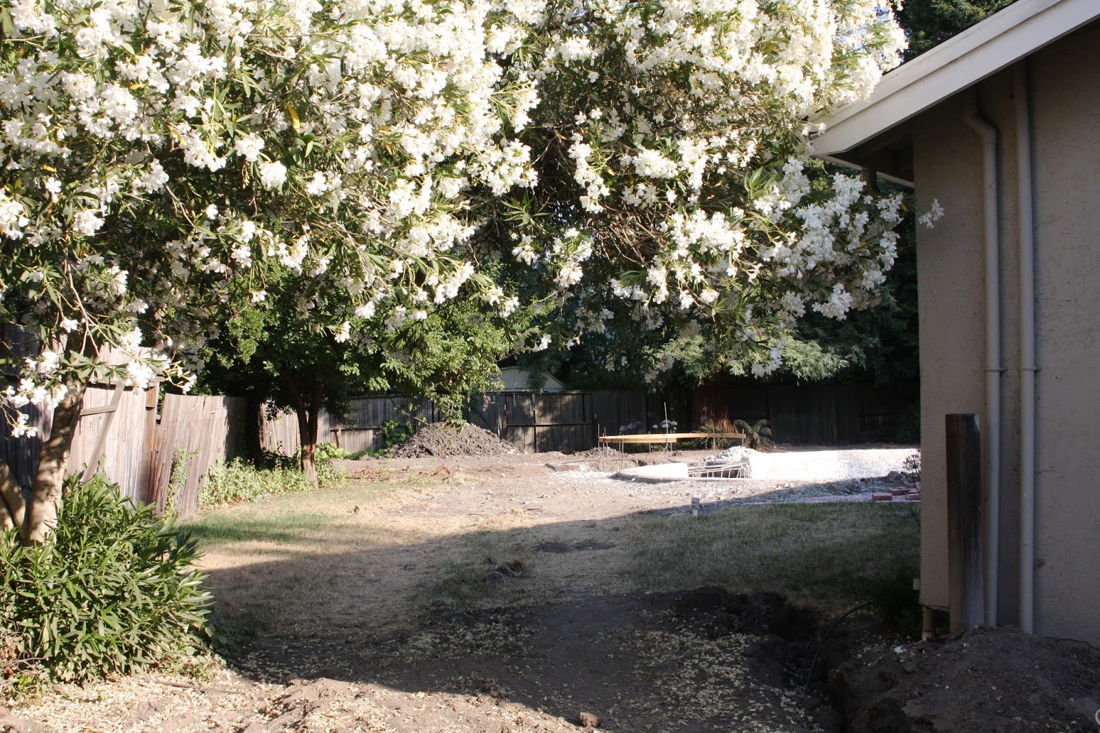 You can see the pool off in the distance. and the leaning fences. And the dirt. And the overgrown trees. and the scattered bricks from the old patio. And the ditches for french drains. Did I mention the dirt? But it’s all good. It means progress!