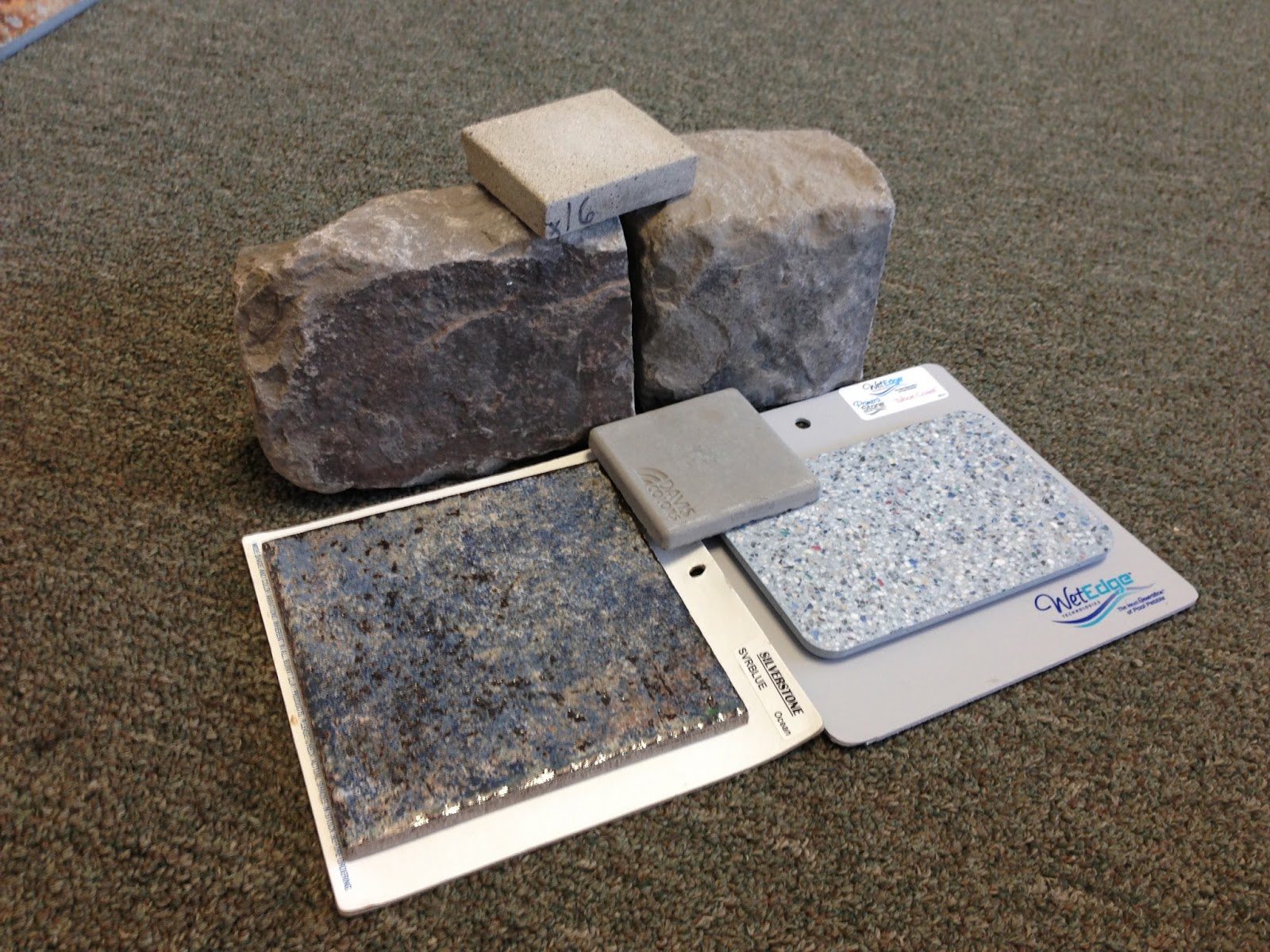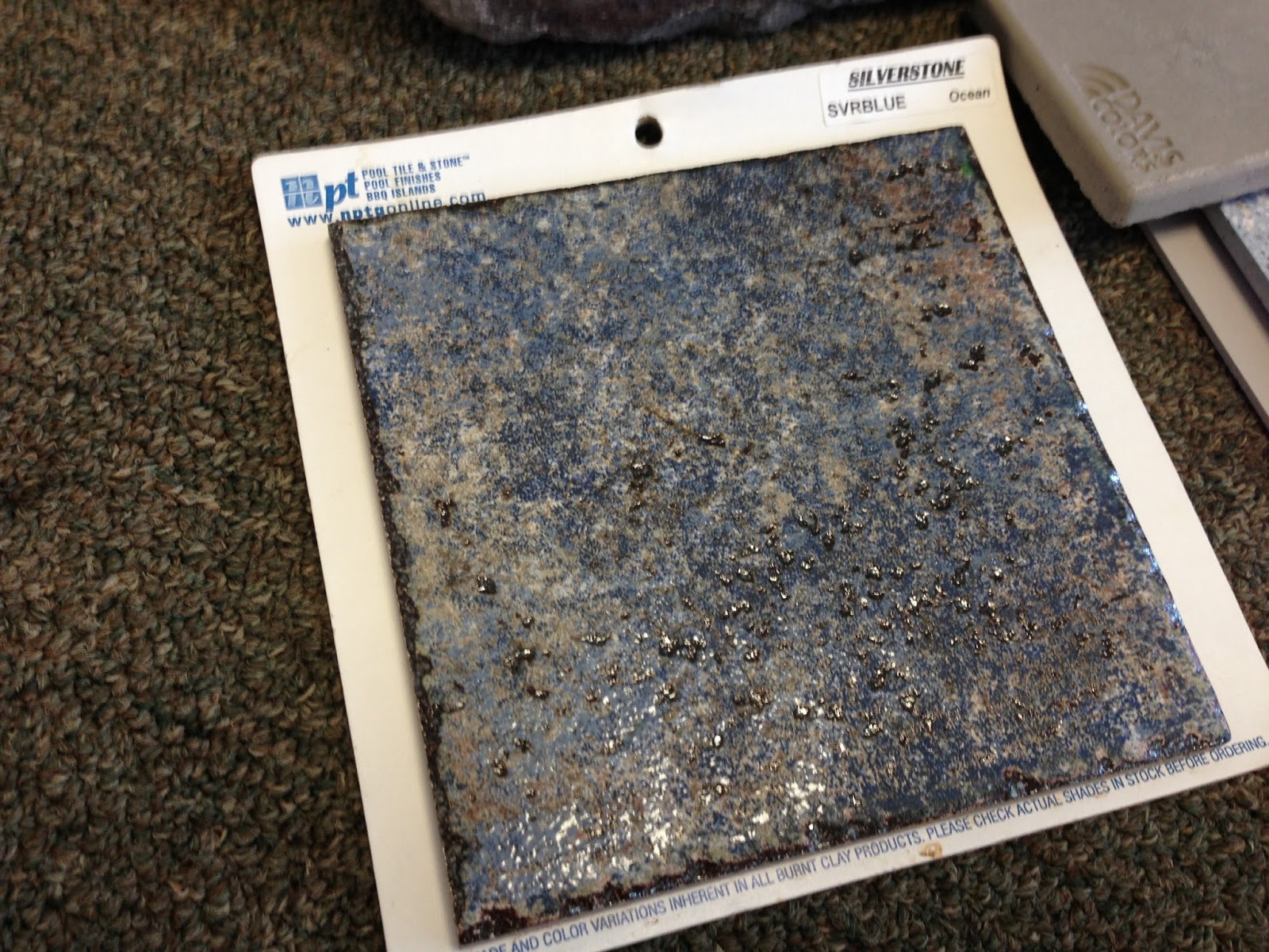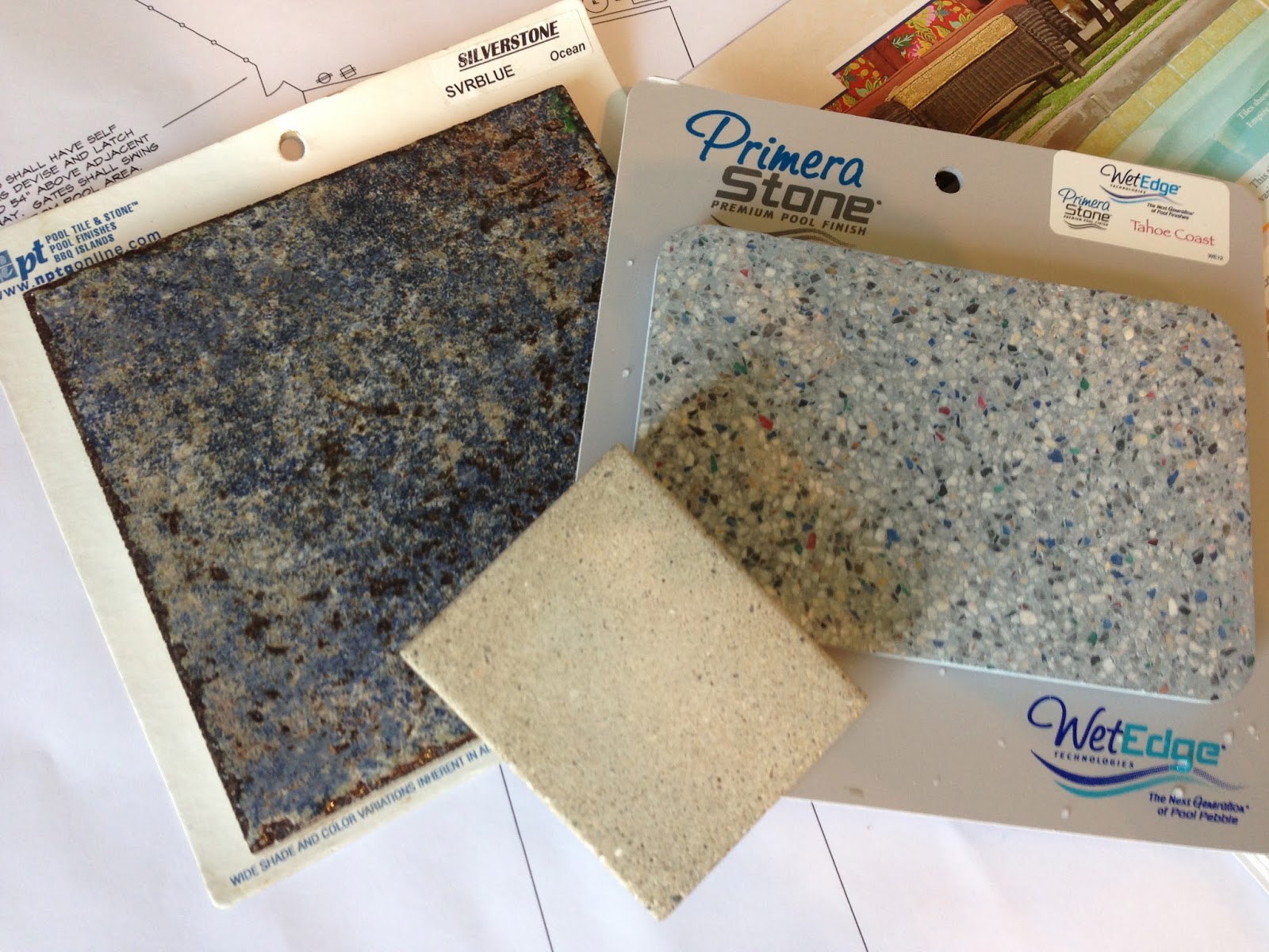 The wet edge product you see is what the pool will be lined with. Instead of your typical plaster, this product makes the pool bottom feel smooth and creates a beautiful water color effect. There are a variety of color options to choose from…from the lightest possible blue to even the blackest water. I chose tahoe coast, which is a beautiful light blue color. the small gray square you see on top will be the concrete pool decking. i’m going with a large 4′ x 4′ geometric shaped concrete…