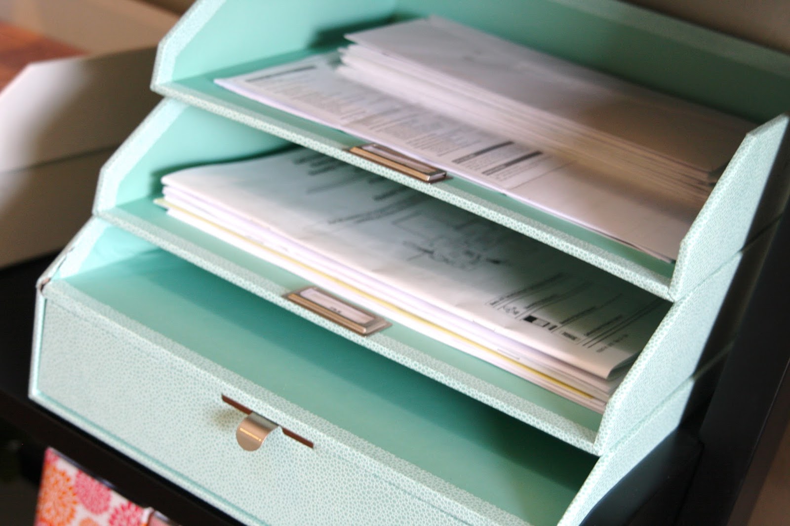 These are a beautiful way to control paper clutter. The white inboxes hold general papers I need to grab in a pinch…