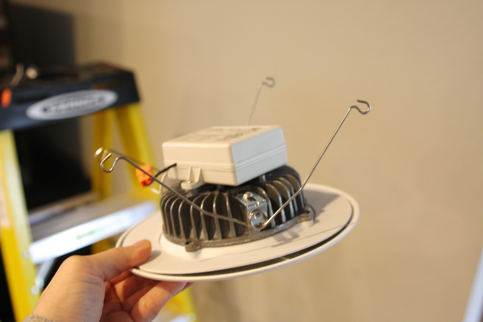 Finally, to get that new light/trim in place, you’ll just pinch on the 2 sets of grabbers (that’s my technical name for those wires with hooks on the end)…