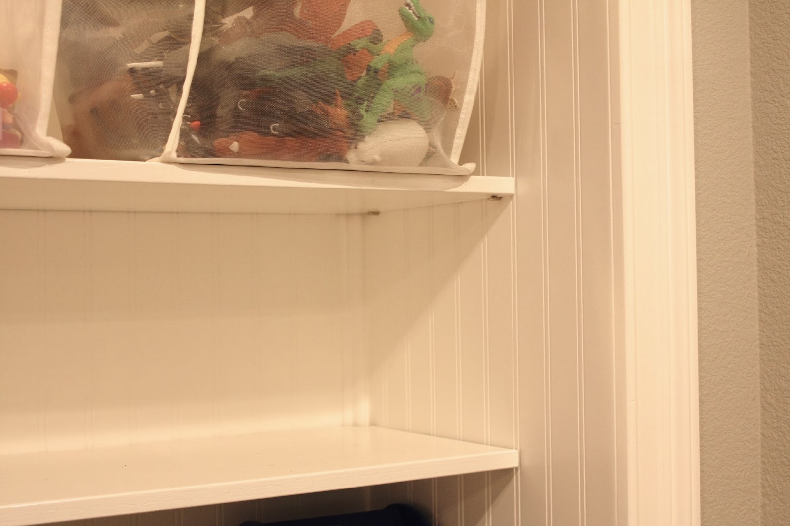 I kept 6 of the folding mesh cubes for additional toy storage on these shelves. Was hoping to leave some open space on the top shelf for framed photos and decor. But the shelves needed adjusting to make that happen. I wanted to bump the cubes down to the next shelf…