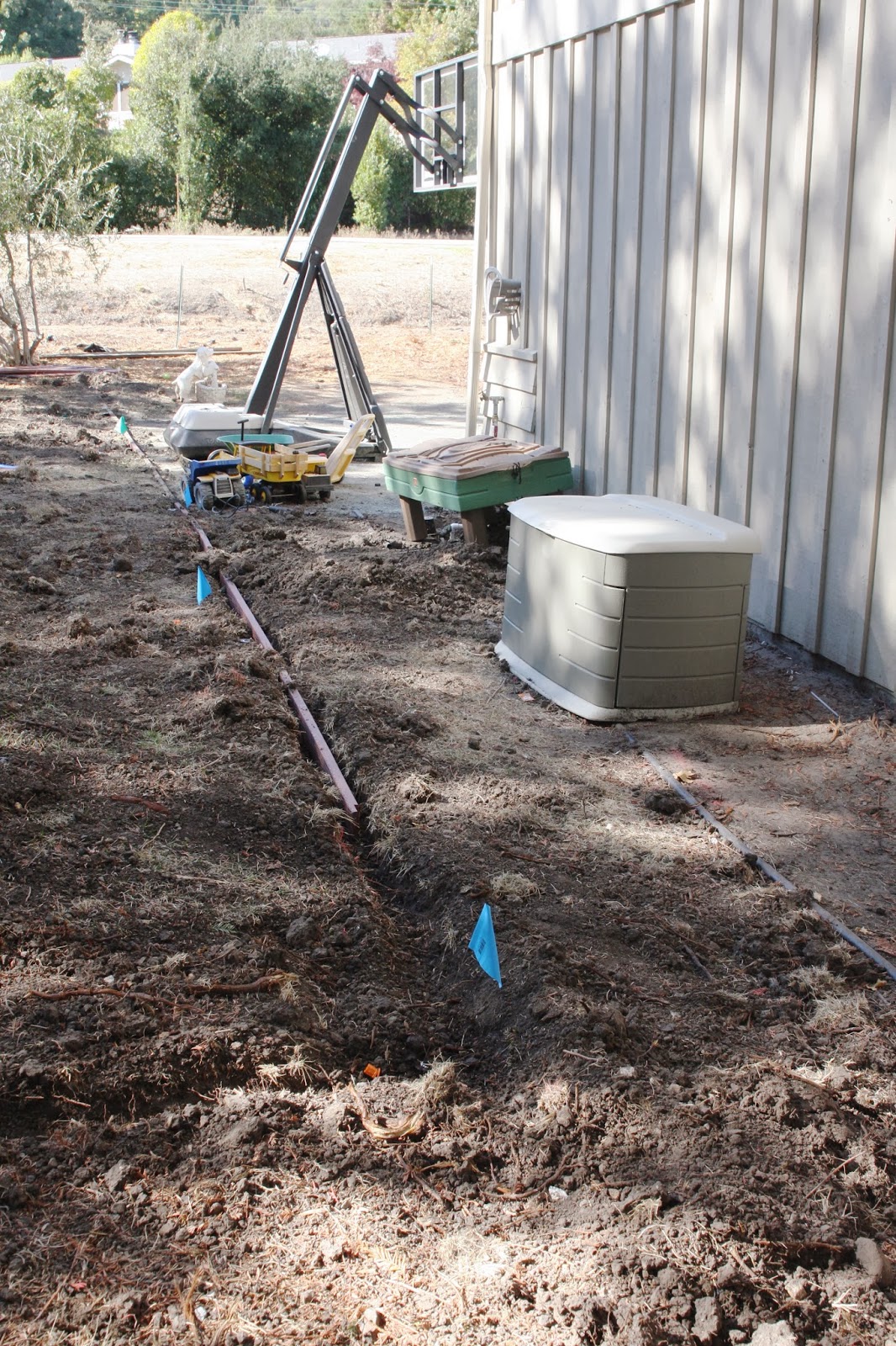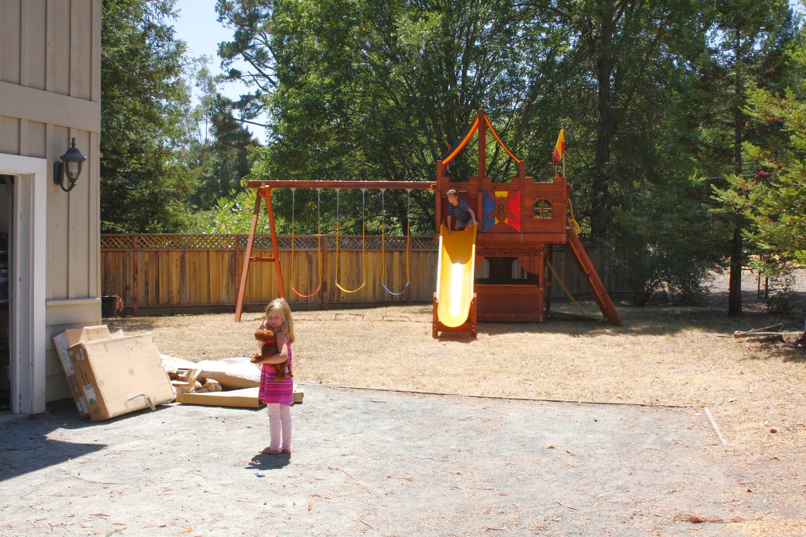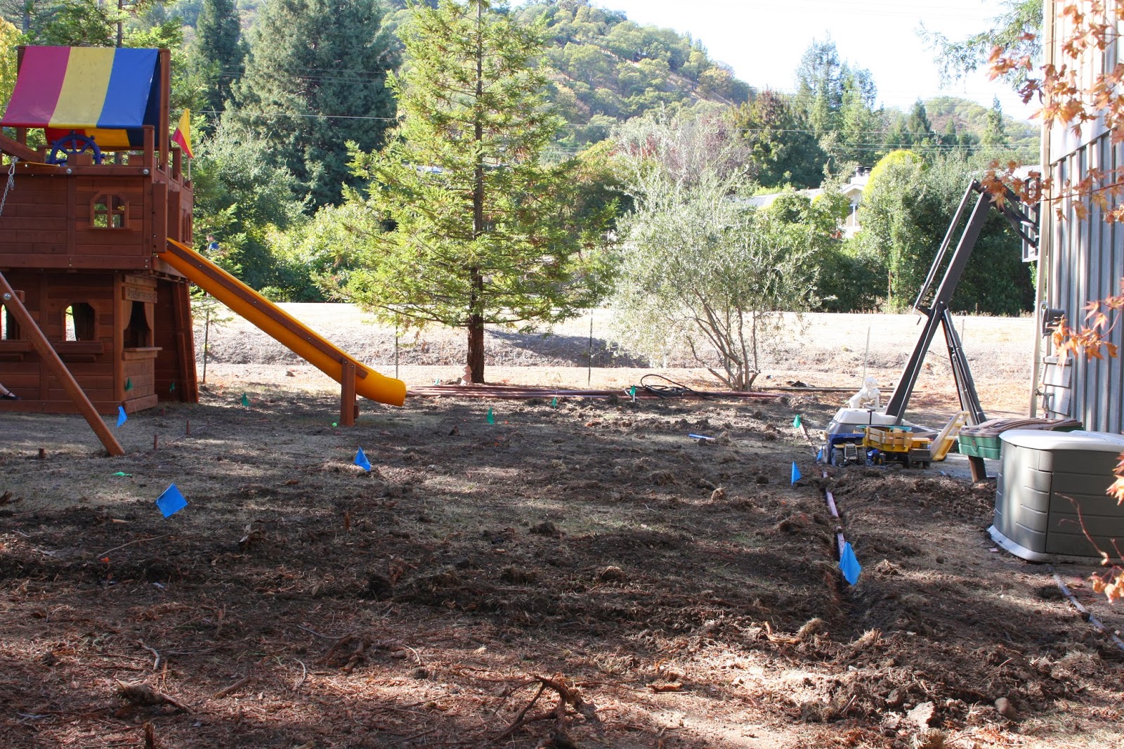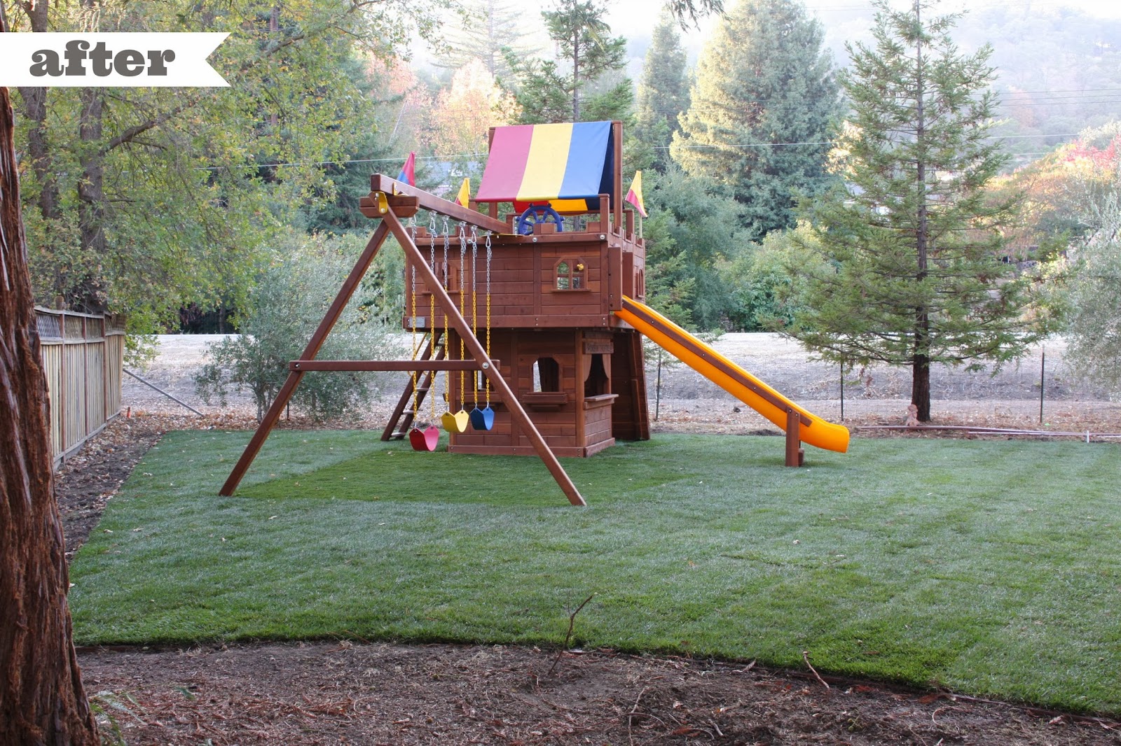 All this area needed was a lot of TLC – Specifically sprinklers, new sod, and an awesome discounted, floor model swing set! Turns out the swing set arrived before sprinklers and grass. It was located and installed before move in…