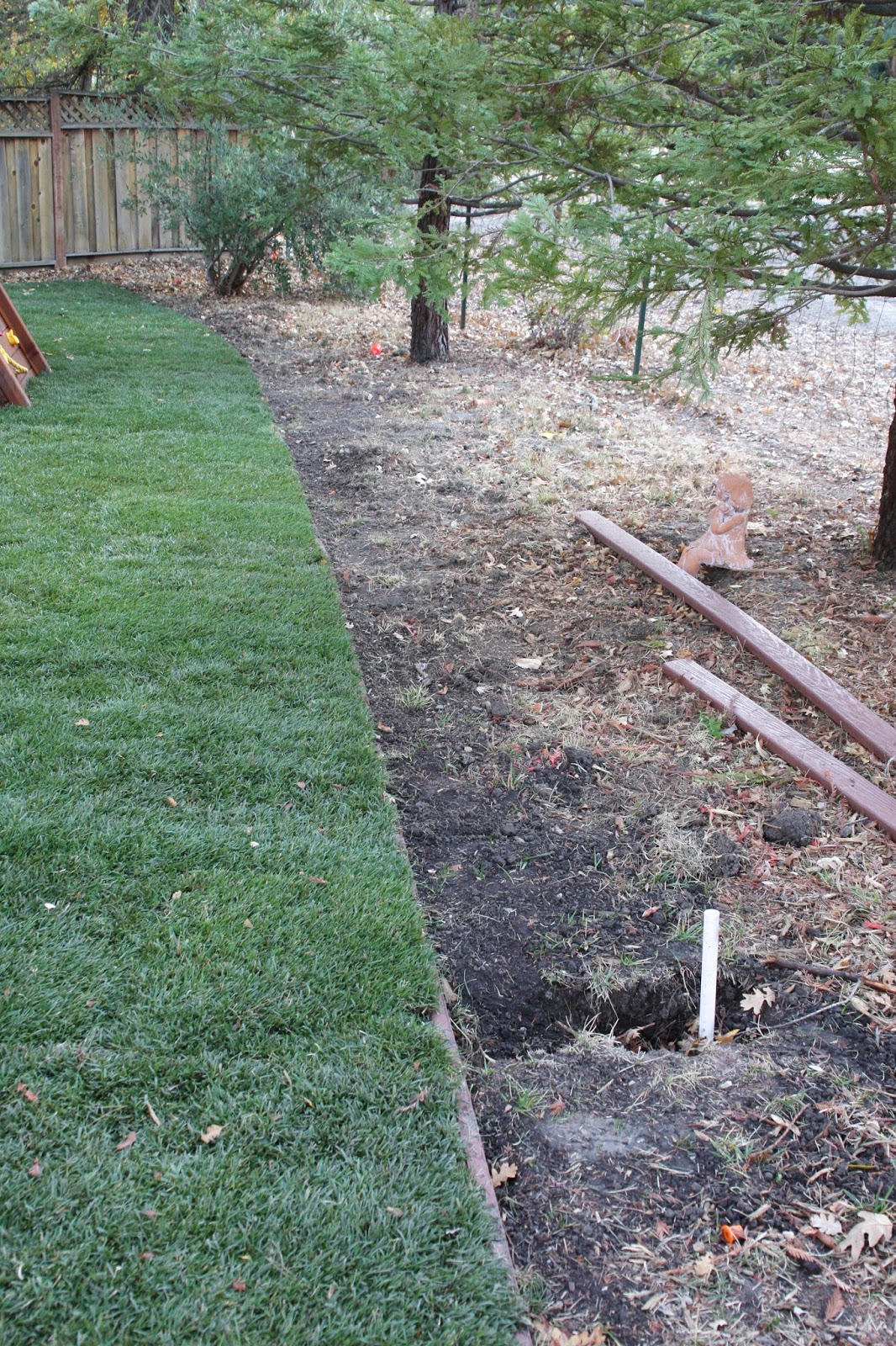 The redwood tree is staying here so we worked around the root system. This will eventually have flowers and meet up with the path…