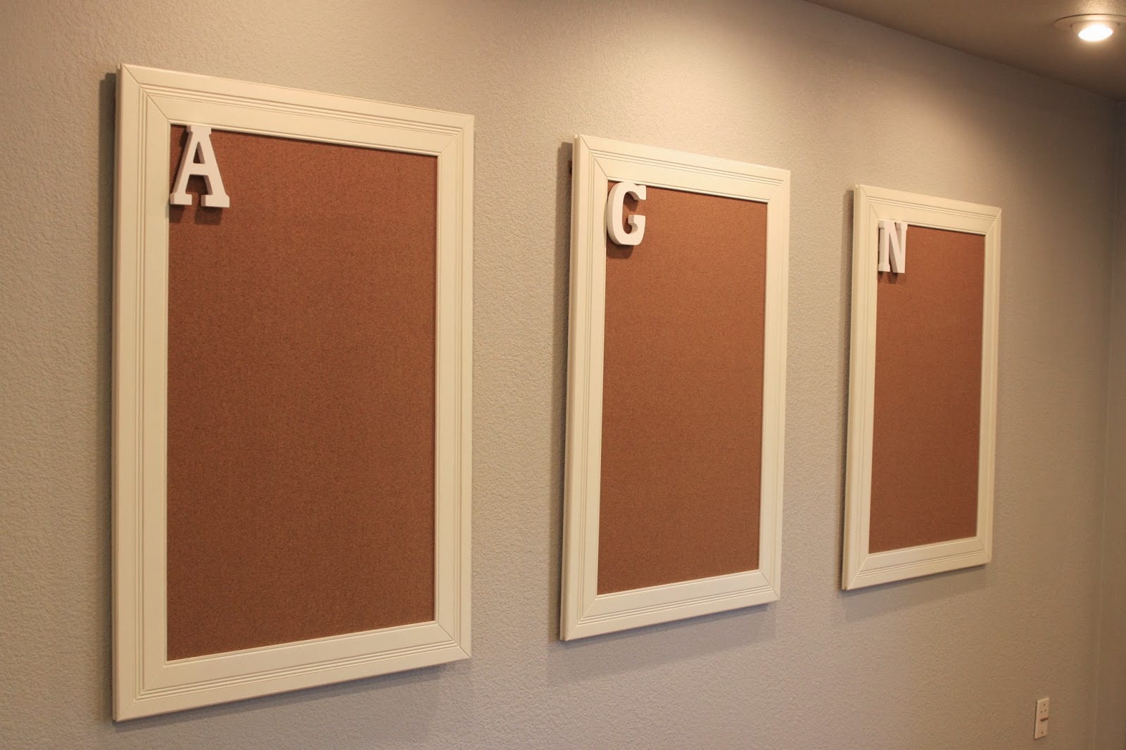 I looked into all sorts of art display options, but ended up going the simple route – 3 white framed cork boards….