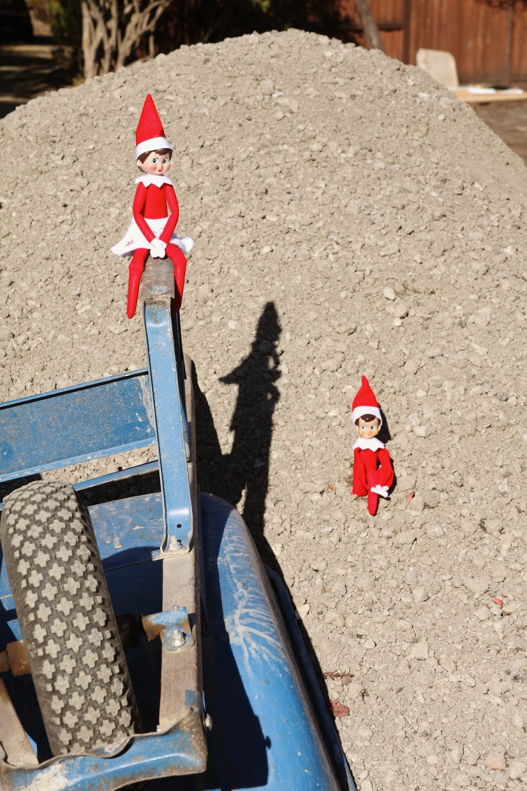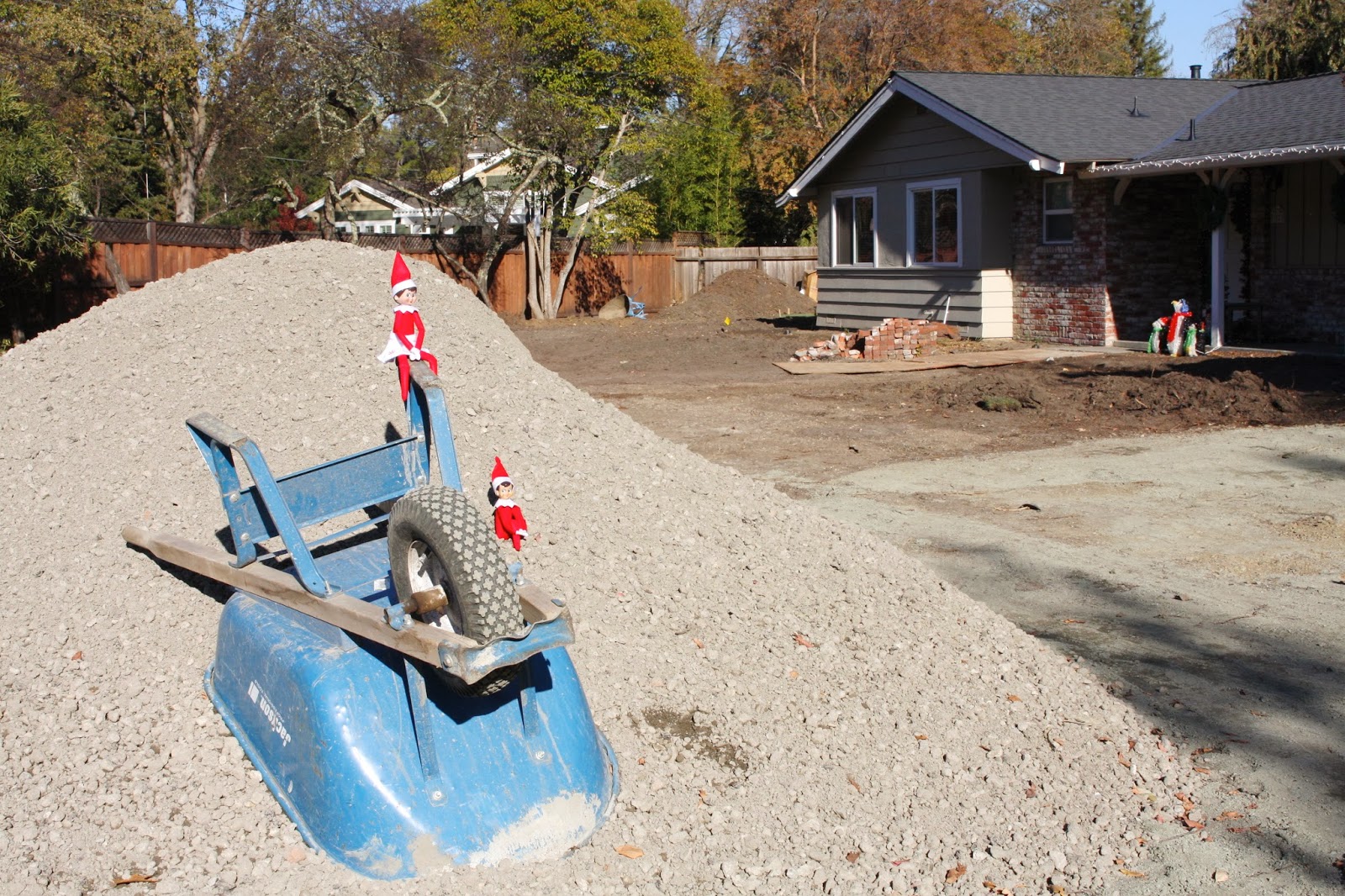 Wouldn’t it be great if these elves would really work some magic? The first thing I would wish for was a completed driveway / front yard. Too bad that won’t work! In the meantime, the elves were trying to help Mom by playing foreman on the construction site…
