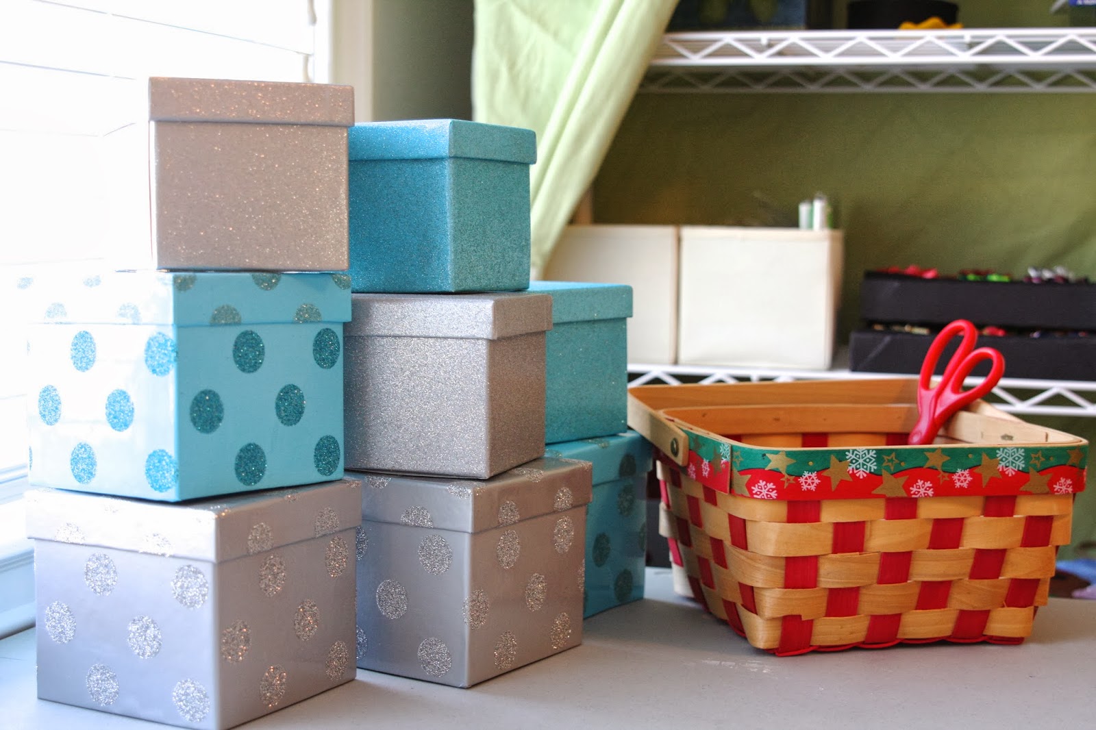 I have those items in a basket so I can easily stow them away on the top shelf when I’m done wrapping each day. The last thing I need is my little people getting into tape, scissors and pens!