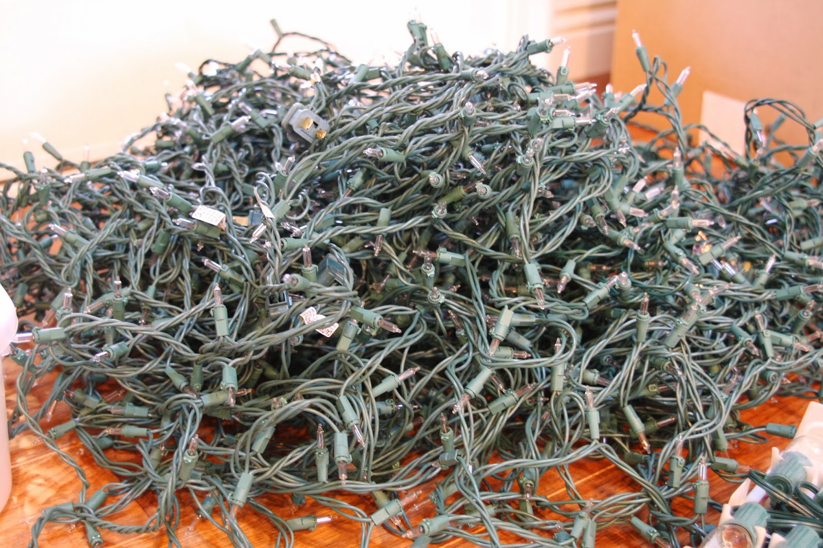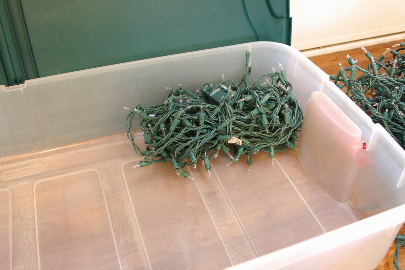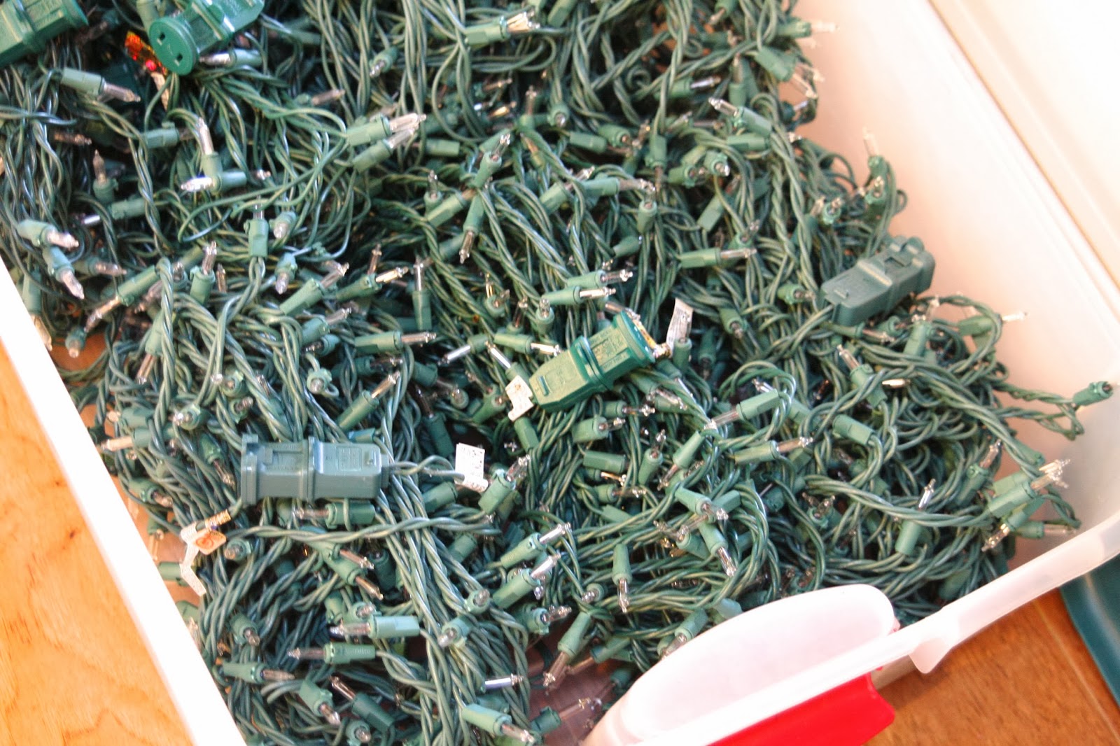 I place the light bundles outlet side up so that next year all I have to do is grab a bundle, detach the outlets, plug in the light string to make sure it works, then easily unravel the bundle…tangle free!….as I decorate the tree or house.