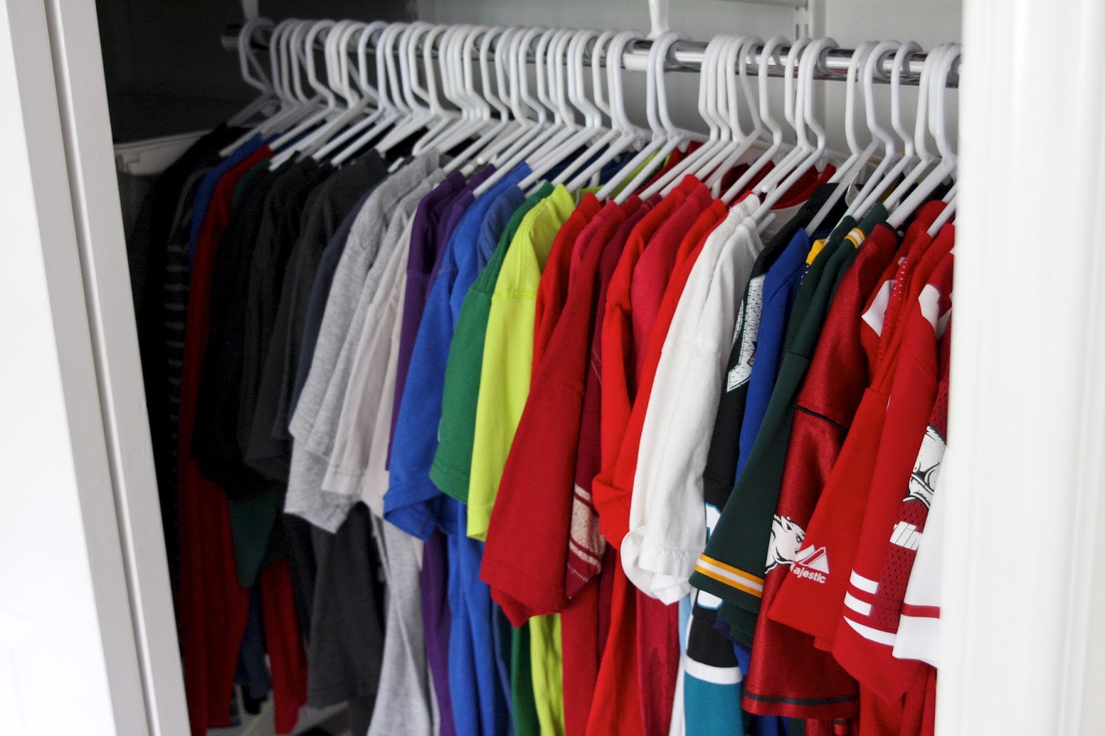 And moved some of the shelving up on this side to accommodate his baseball items, which made room for 5 mesh drawers underneath…