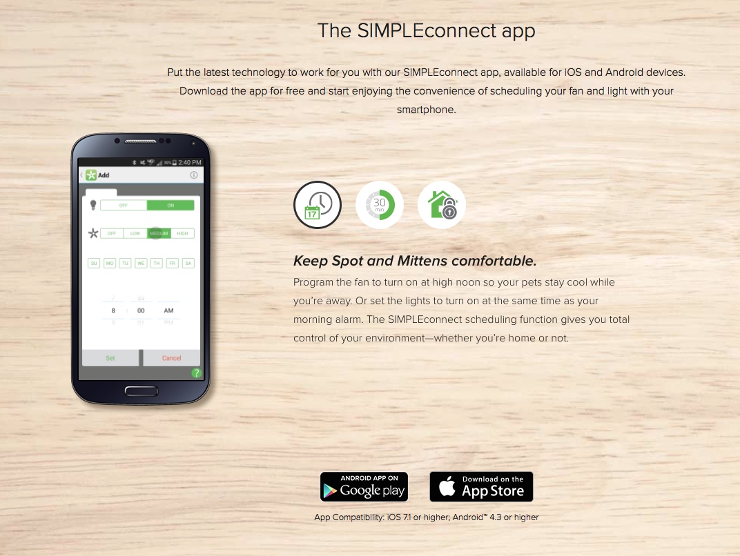 With the SIMPLEConnect app you set the schedule! Decide when the fan turns off and on, the speed, dim the lights and more!…