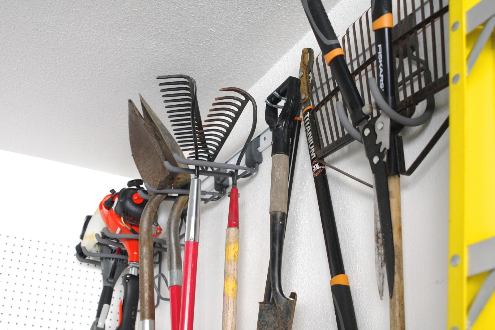 You’ll notice in between the workspace and the toolbox I have the gardening tools up on the wall. This was a very helpful yet simple and easy project too! Just used Container Store utility track and components to get these bulky guys up off the floor…