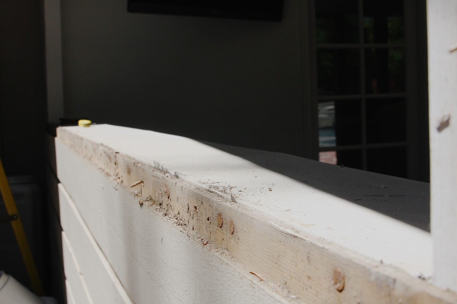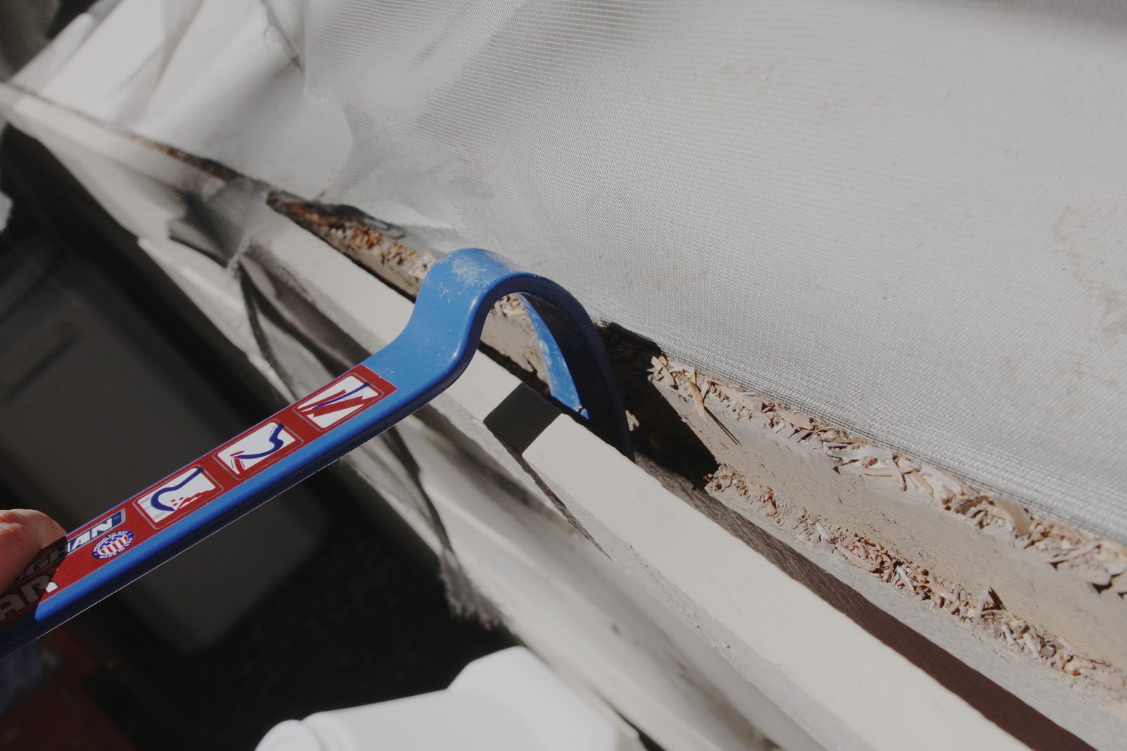 My plan was to remove these pieces as gently as possible so I could recycle and put them back up. But the wood was so old and worn that it cracked and splintered into pieces with each small pull of the crow bar. After removing the bottom moulding on this end of the patio, I gave up and decided it would all be tossed and new moulding added. (That’s another project I’ll be sharing soon!)