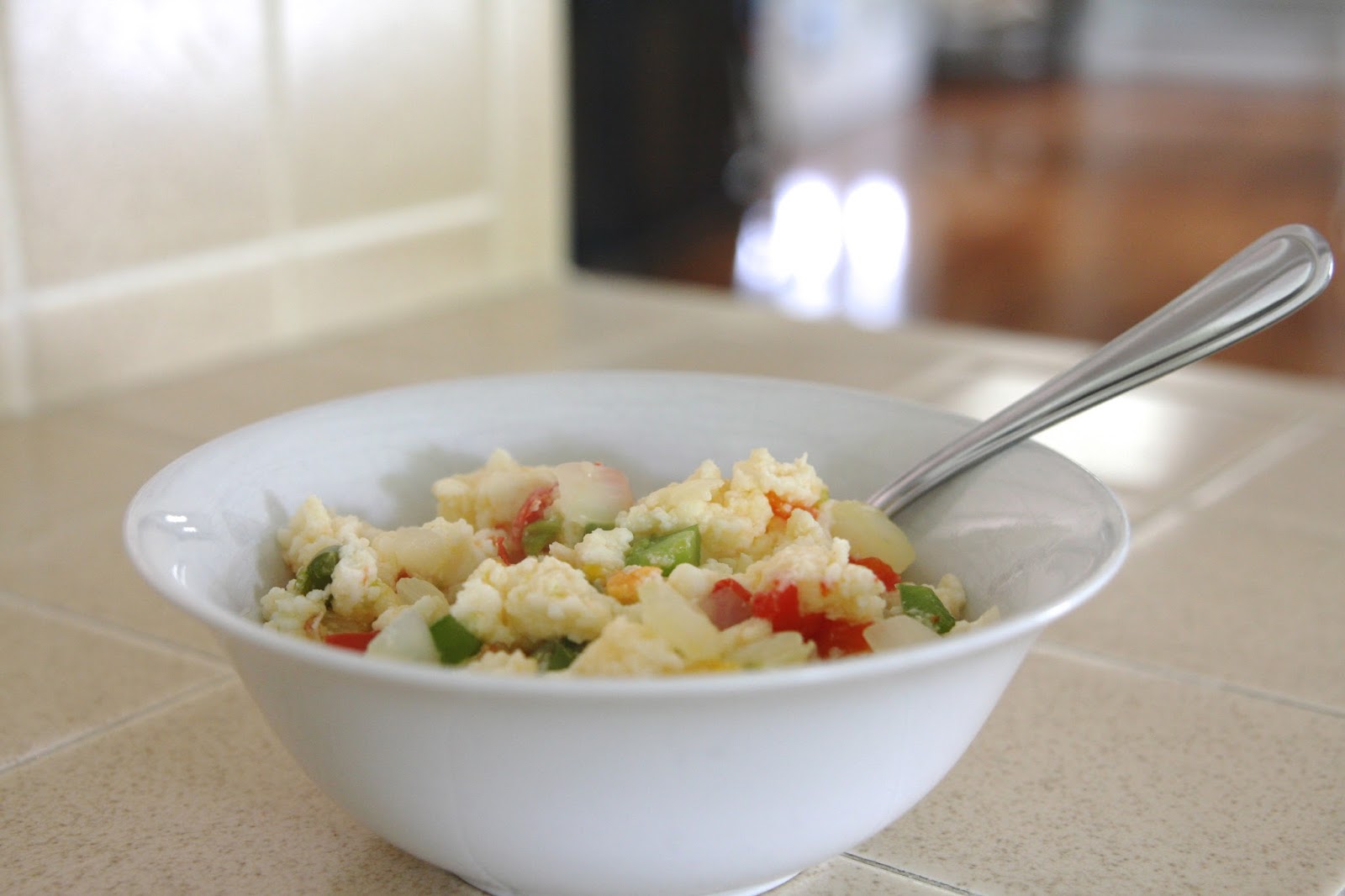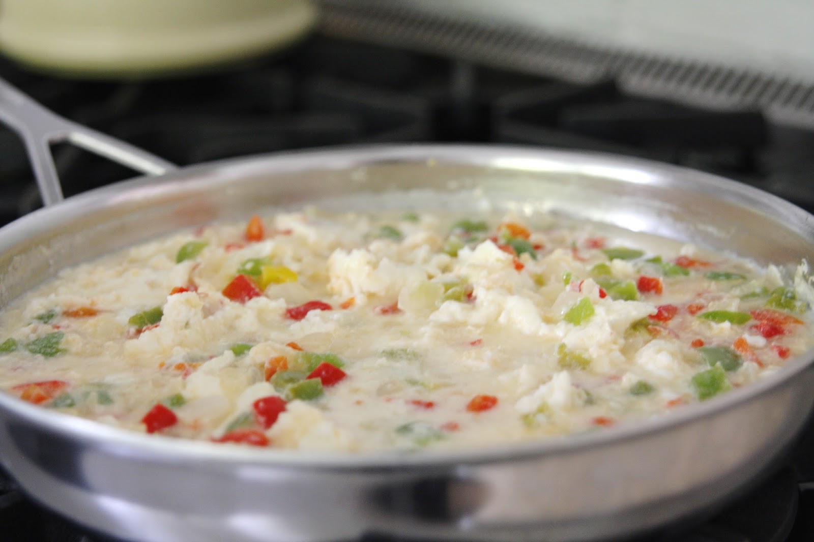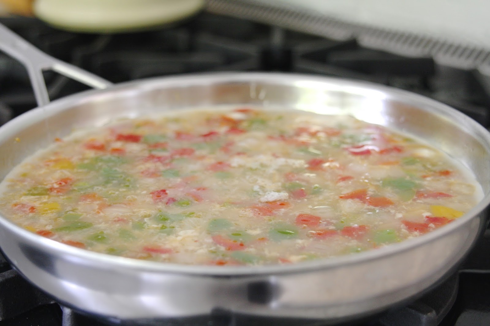 When the onions and peppers are soft, I pour a whole container of egg whites into the pan…